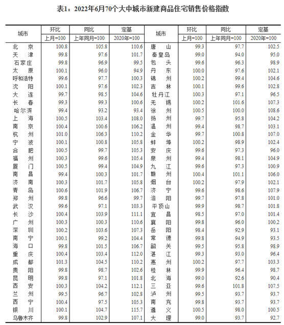 国家统计局城市司首席统计师绳国庆指出,2022年6月份,70个大中城市商品住宅销售价格环比总体趋稳,环比上涨城市个数增加,同比继续走低,同比上涨城市个数减少。