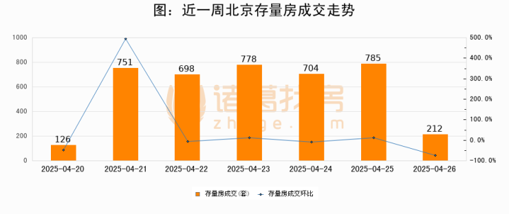 从存量房来看,2025年04月26日北京存量房单日成交212套,比昨日减少573套,环比下降73%。从近一周存量房成交来看,北京存量房日均成交套数为579套,04月26日单日成交212套,低于近一周平均水平63.4%。