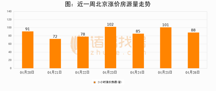 根据诸葛找房数据显示,北京24小时涨价房源量为88套,较04月25日减少13套,环比下降12.9%。与此同时,涨价房源占比小幅回落,对于购房者来说是一个入市窗口期,购房者可抓住时机入市。