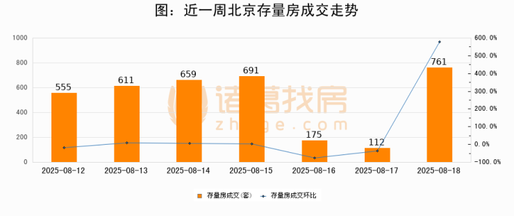 从存量房来看,2025年08月18日北京存量房单日成交761套,比昨日增加649套,环比上涨579.5%。从近一周存量房成交来看,北京存量房日均成交套数为509套,08月18日单日成交761套,高于近一周平均水平49.5%。