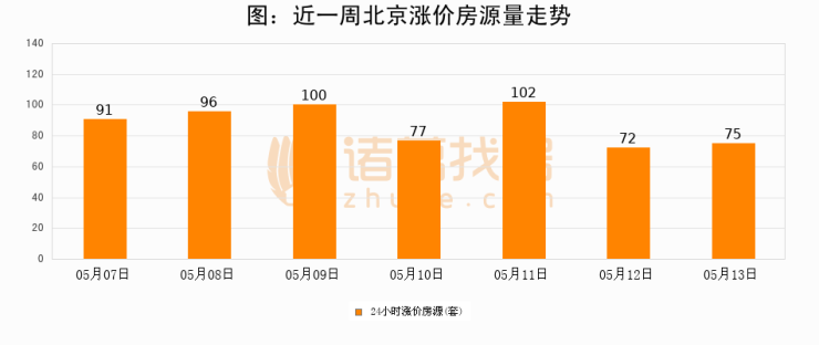 根据诸葛找房数据显示,北京24小时涨价房源量为75套,较05月12日增加3套,环比上涨4.2%。与此同时,涨价房源占比小幅扩大,业主信心有所提升。