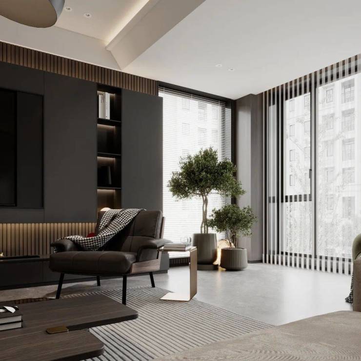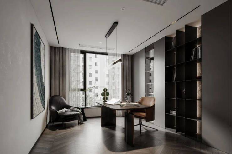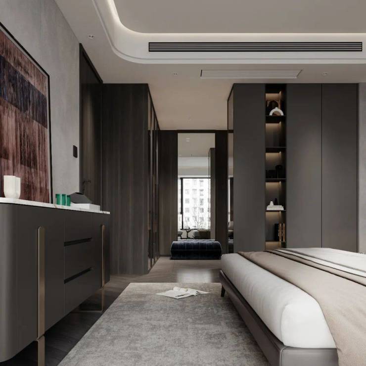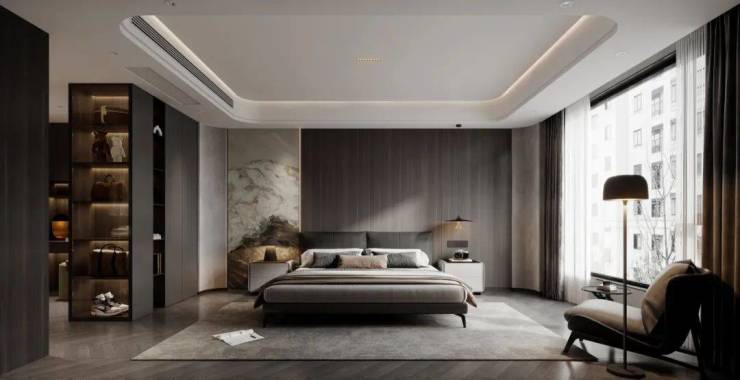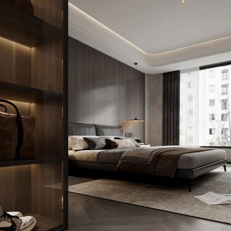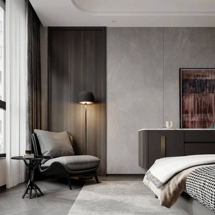 进入主卧,在屋主喜爱的深色调中加入偌大的落地窗,明亮的自然光线透过柔软的纱窗,洒满全屋,让气氛带着些许惬意,饱满的灰色调传递出沉静优雅的同时,也维持了空间的高级感。