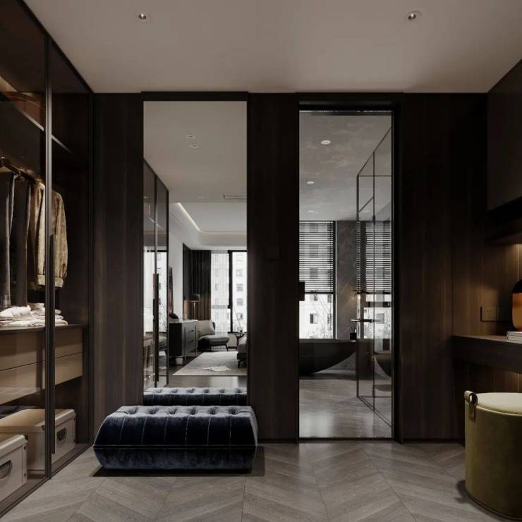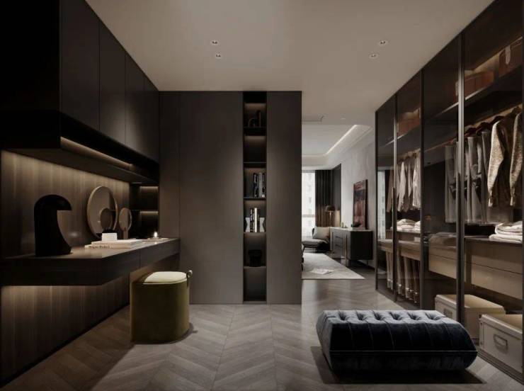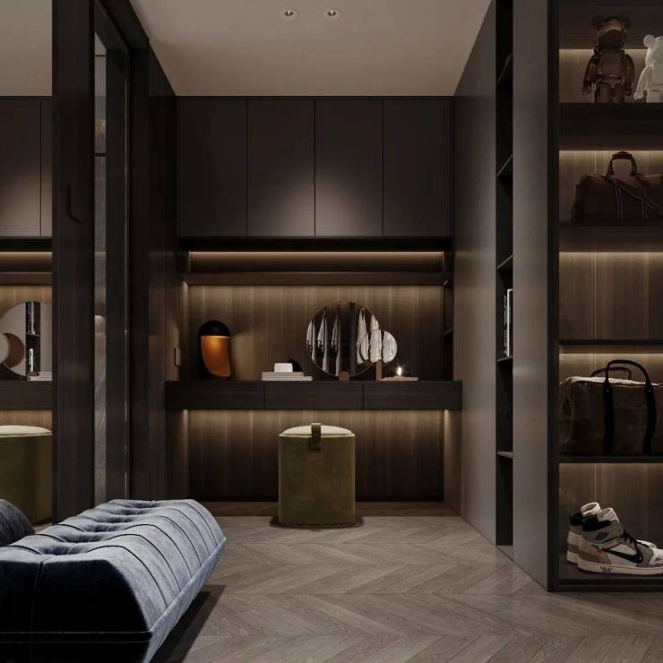 自然光延伸到衣帽间,一个专属的衣帽间,承载了屋主人内心的向往与追求。深色的木纹与灯光的搭配,兼具着古典的气质与现代功用,精致有序的储物空间丰富而有克制,将整个空间的艺术气质展现得淋漓尽致!