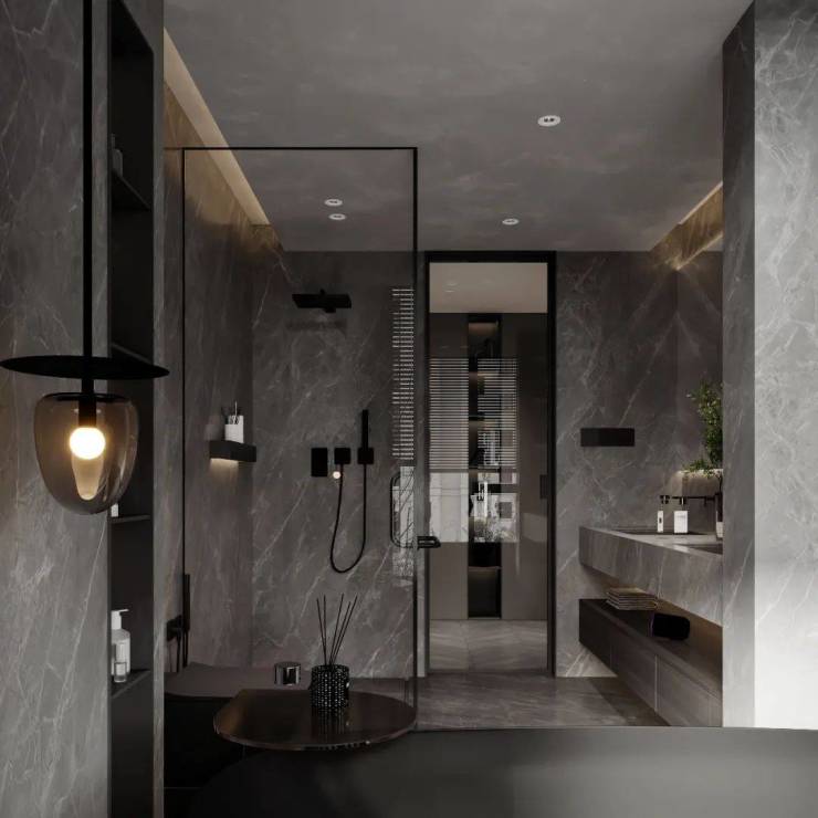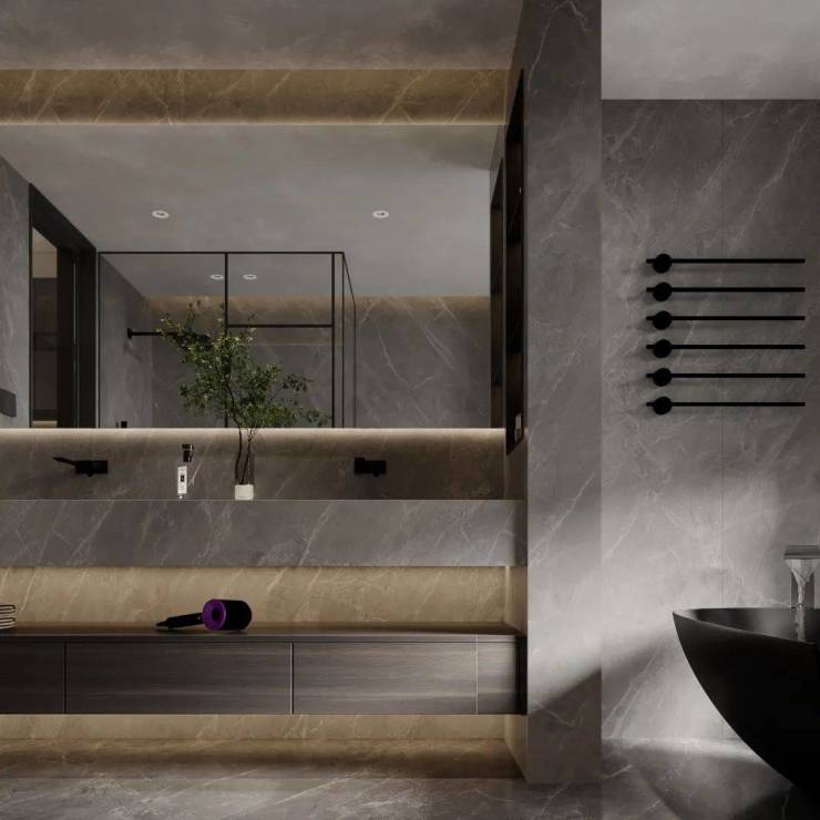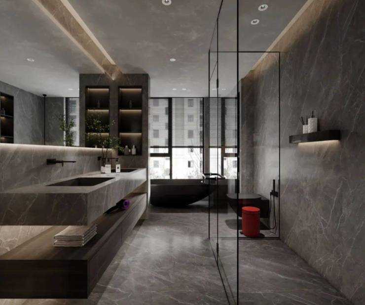 潮流的大理石砖,自墙面蔓延到整个空间,低调中给人沉稳的力量。不规则图案勾勒出神秘优雅的韵味,让卫浴间拥有独特的艺术美感。