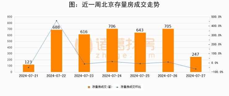 从存量房来看,2024年07月27日北京存量房单日成交247套,比昨日减少458套,环比下降65%。从近一周存量房成交来看,北京存量房日均成交套数为532套,07月27日单日成交247套,低于近一周平均水平53.6%。