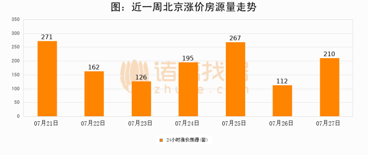 根据诸葛找房数据显示,北京24小时涨价房源量为210套,较07月26日增加98套,环比上涨87.5%。与此同时,涨价房源占比小幅扩大,业主信心有所提升。