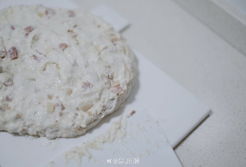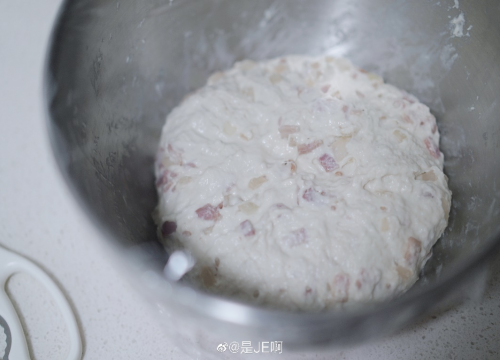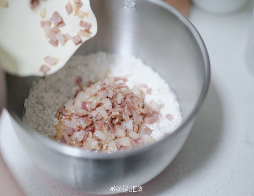 准备材料:高筋粉360g,水320g,酵母2g,盐5g,培根120g,洋葱100g