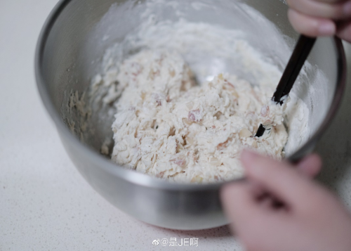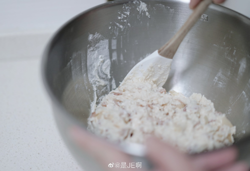 3接着用刮刀拌匀,盖上保鲜膜准备发酵;