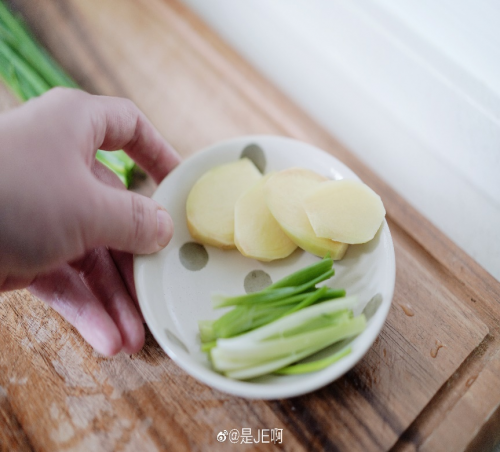2小葱切小段铺满珐琅锅锅底,撒上姜片倒入花生油,晃均匀;