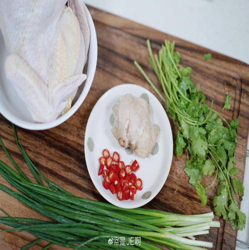 准备材料:整鸡1只(不要太大的),香菜、小葱、红辣椒适量,盐、料酒、生抽、白胡椒粉、花生油适量