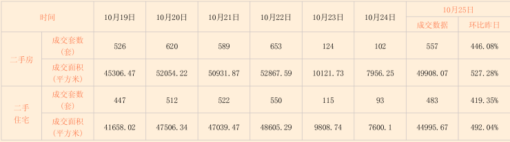 10月25日,北京市二手房成交557套,环比昨日上涨446.08%,二手房成交面积49908.07㎡,环比昨日上涨527.28% ;其中,二手住宅成交483套,环比昨日上涨419.35%,二手住宅成交面积44995.67㎡,环比昨日上涨492.04% 。