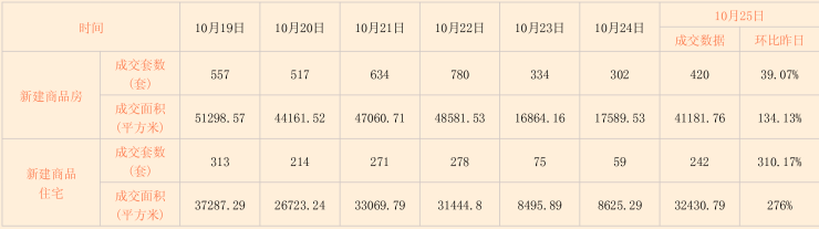 10月25日,北京市新建商品房成交420套,环比昨日上涨39.07%,新建商品房成交面积41181.76㎡,环比昨日上涨134.13% ;其中,新建商品住宅成交242套,环比昨日上涨310.17%,新建商品住宅成交面积32430.79㎡,环比昨日上涨276% 。