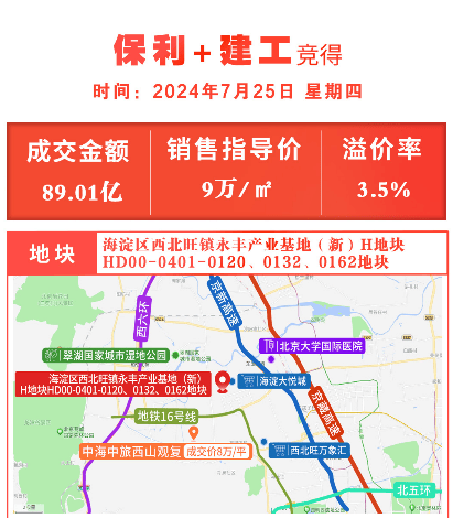 2024年7月25日保利+建工以89.01亿竞得海淀区西北旺镇永丰产业基地(新)H地块HD00-0401-0120、0132.0162等地块,溢价率3.5%,销售指导价9万/㎡。