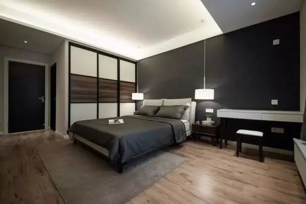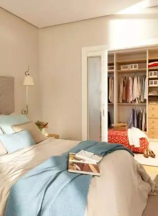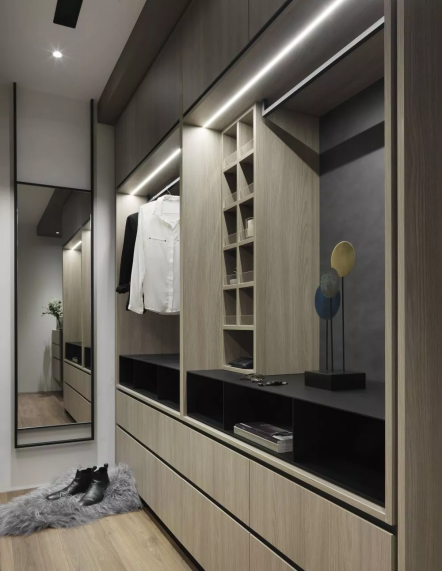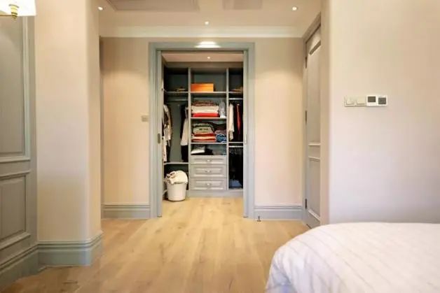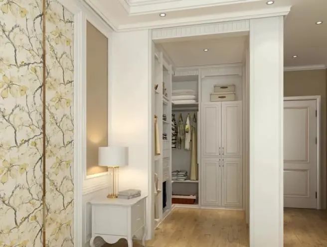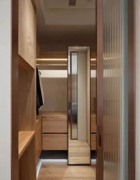 ③衣柜设计。主卫改衣帽间里的衣柜不要做到顶,跟吊顶之间保持10cm左右间距,同时衣柜背面也不要紧贴墙壁。