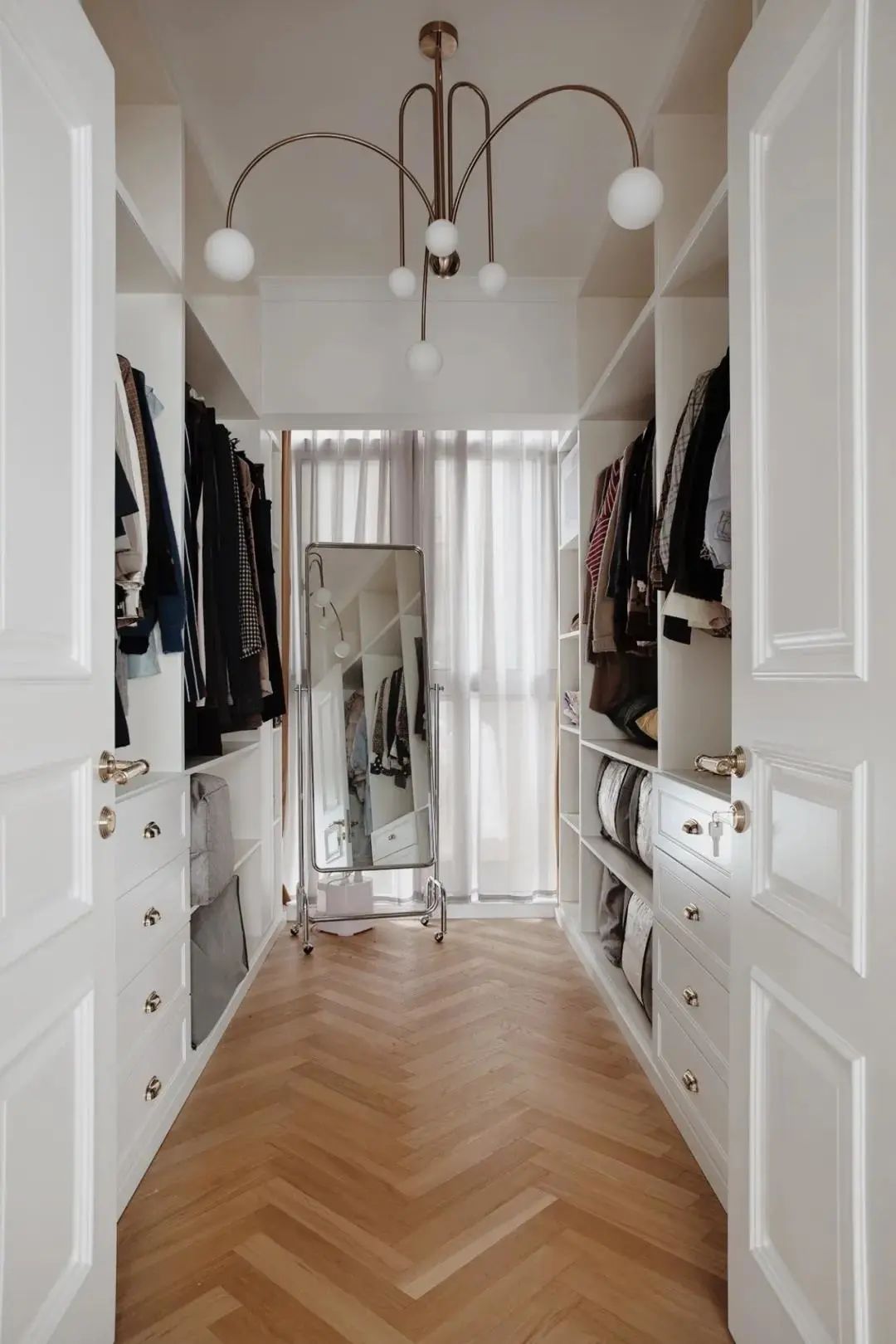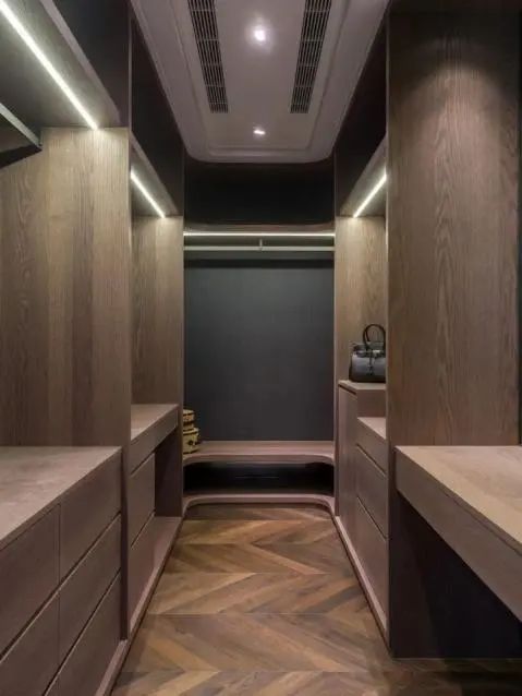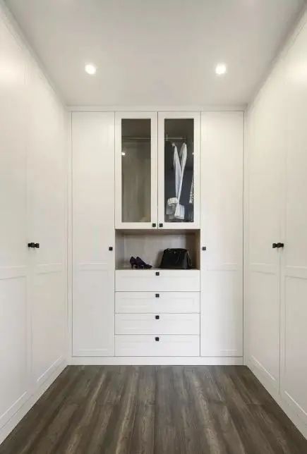 这种布局适合长方形空间,可以充分利用其宽度和深度。要说L型格局受欢迎的主要原因还得是,吊挂或叠放各类衣物和配件,并不会显得空间压抑,拿取自如的同时,给人宽敞的空间感。