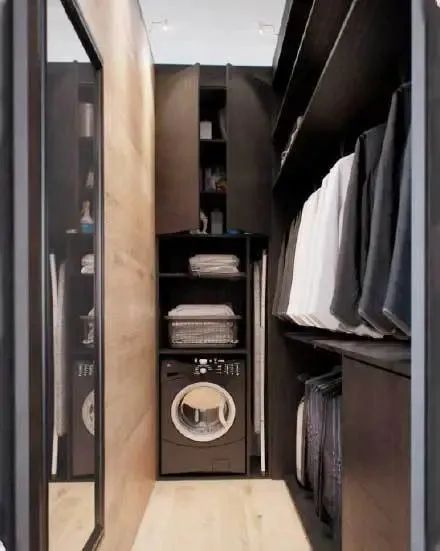 如果你家主卫面积只有三四平方米,就可以采用这种布局方式。选其中一面墙做柜子,在对面墙装穿衣镜,宽度足够的情况下。