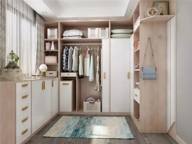 还可以选择衣柜与梳妆台相结合,这样衣帽间的功能区域要相对更加丰富。