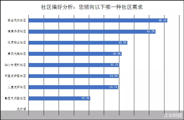 而在“社区偏好”方面,46.1%的刚需样本户家庭表示更倾向于选择安全无忧型社区,即在居住体验方面安全舒心,监控、防护措施到位,安全性较高;