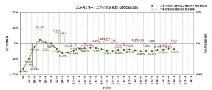 但,截至2024年9月28日,北京市一二手住宅9月累计网13854套,同比8月同期(17076套)下滑18.87%,下滑幅度较前日扩大1.72%。