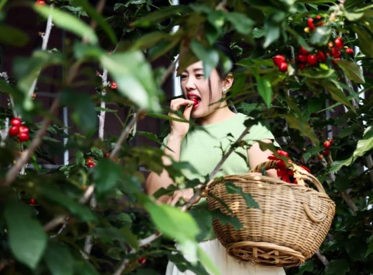 2024年,一名游客在山东省日照市东港区南湖镇山村水乡开心农场品尝樱桃。 兰红光 图