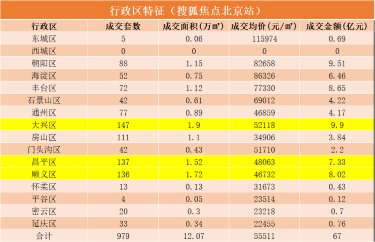 在新房区域成交金额排行中,大兴区、朝阳区、丰台区排名前三,分别为9.9亿元、9.51亿元、8.65亿元。