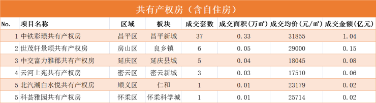 共有产权房市场中,各项目间差距较大。昌平区的中铁彩璟以37套的成交量跃居排名前列,成交金额分别达1.04亿元。第二第三分别为房山区的世茂轩景颂和延庆区的中交富力雅郡,分别成交6套和3套,其余项目成交都不甚景气。