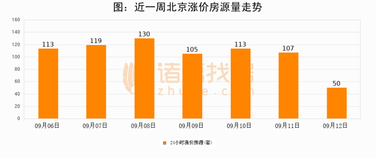 根据诸葛找房数据显示,北京24小时涨价房源量为50套,较09月11日减少57套,环比下降53.3%。与此同时,涨价房源占比小幅回落,对于购房者来说是一个入市窗口期,购房者可抓住时机入市。