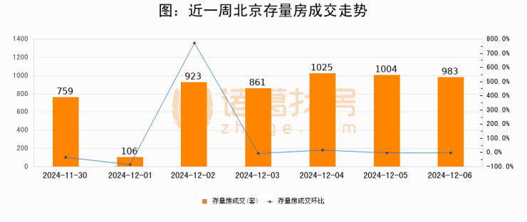从存量房来看,2024年12月06日北京存量房单日成交983套,比昨日减少21套,环比下降2.1%。从近一周存量房成交来看,北京存量房日均成交套数为808套,12月06日单日成交983套,高于近一周平均水平21.7%。
