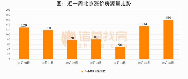 根据诸葛找房数据显示,北京24小时涨价房源量为159套,较12月05日增加25套,环比上涨18.7%。与此同时,涨价房源占比小幅扩大,业主信心有所提升。
