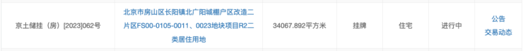 房山长阳0011、0023地块,仅城建1家房企报名报价,最终以12亿元底价成交,楼面价约1.87万/平米。
