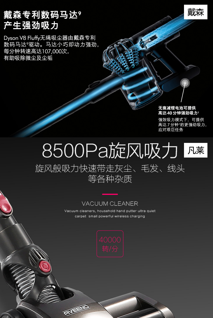 马达相当于车用吸尘器的心脏,马达的性能决定了车用吸尘器的性能。戴森v8使用的是戴森专利数码马达,马达小巧却动力十足,转速高达每分钟107,000次,能很好地吸除车内的微尘及尘垢。而凡莱号称有8500Pa的旋风吸力,能像旋风般快速带走灰尘、毛发、线头等各种杂质,但实际上每分钟的转速只有40,000次,让人不得不对其性能描述的真实性产生质疑。与戴森107,000次的转速毫无可比性。