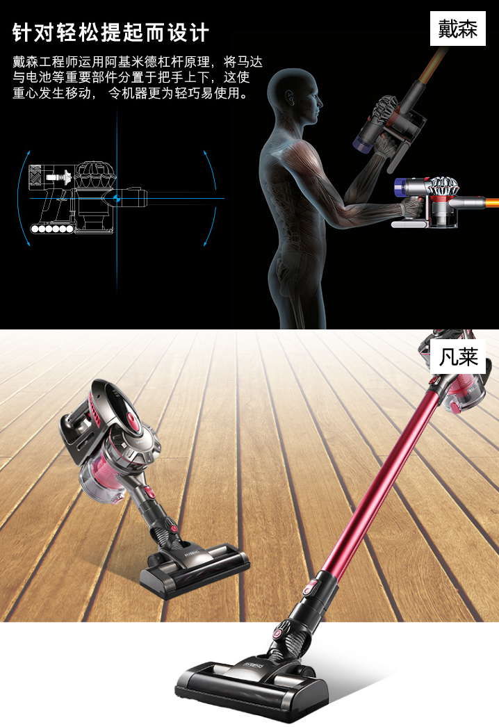 车内清洁本就是一件比较消耗体力的事,因此车用吸尘器的设计要更加人文化。戴森v8在设计之初就充分考虑到使用的便捷度。戴森v8为了使重心偏移,减轻使用时的负担,将马达与电池等重要部件分置于手把上下,令机器更为轻巧易使用。而凡莱似乎并未考虑到这一点,依旧是大众化的设计。