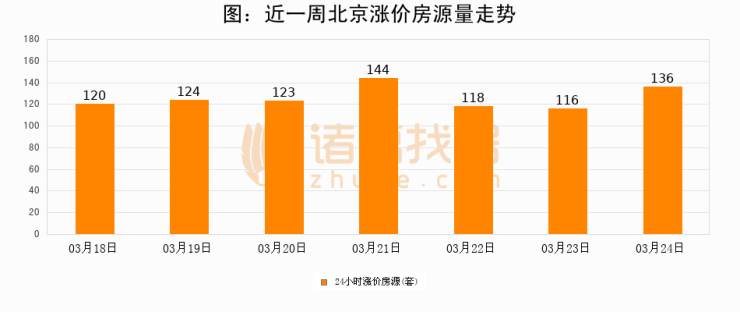 根据诸葛找房数据显示,北京24小时涨价房源量为136套,较03月23日增加20套,环比上涨17.2%。与此同时,涨价房源占比小幅扩大,业主信心有所提升。