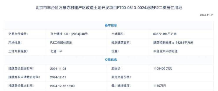 万泉寺0024地块,没有捆绑,单个地块起始价110.54亿,也是今年北京真正的“地王”项目。