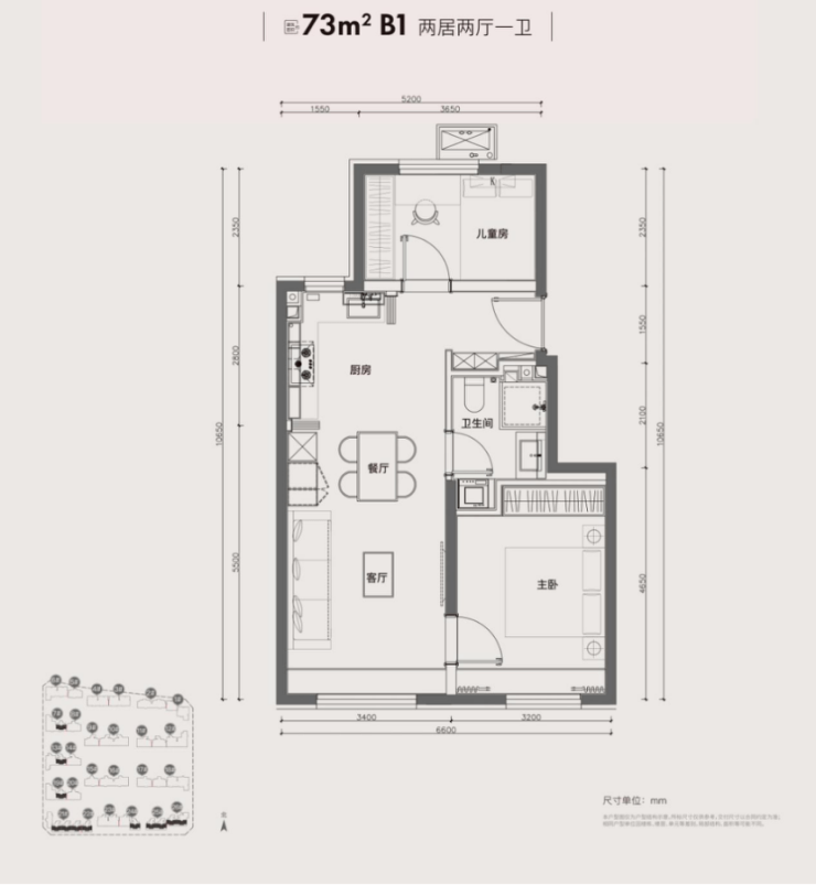 北侧儿童房可做家庭的灵动空间,开放式厨房采用L型设计,与餐厅客厅形成完整的动线。