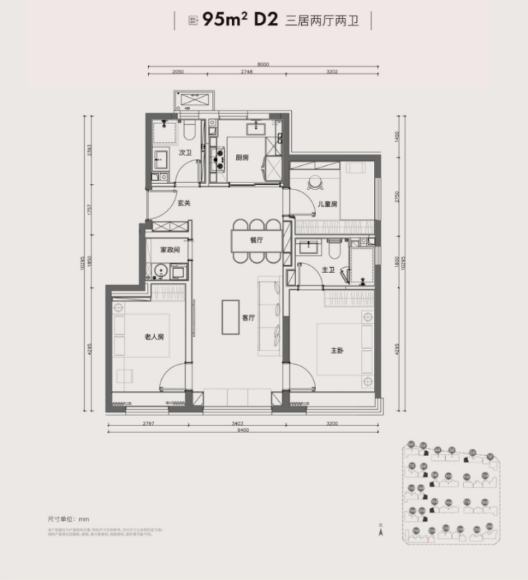 95平三居,南向三面宽,南北通透,经典的四叶草布局(需要注意,与过程稿不同)。