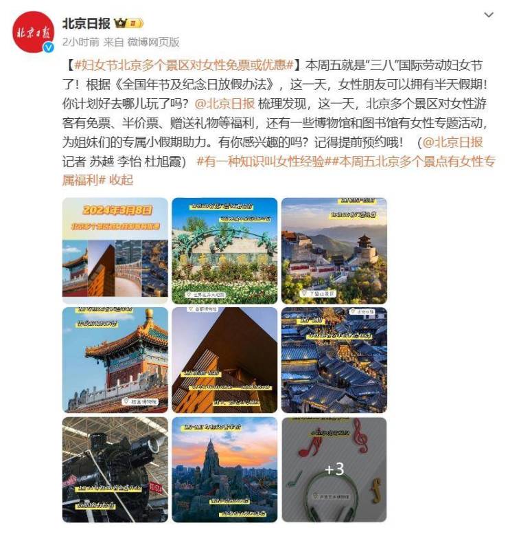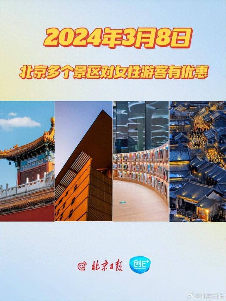 明天是“三八”国际劳动妇女节,女性朋友可以拥有半天假期。北京多个景区为女性游客提供免票、半价票、赠送礼物等福利,一些博物馆和图书馆也有女性专题活动。记得提前预约哦!