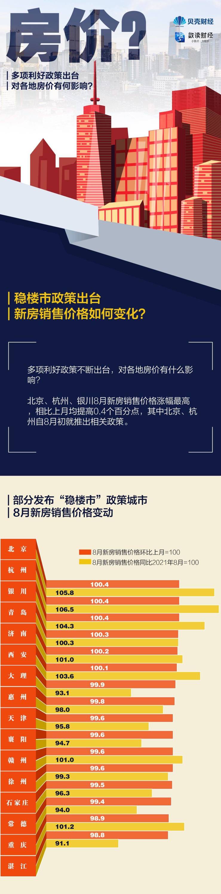 北京、杭州、银川新房销售价格涨幅较高,相比上月均提高0.4个百分点,其中北京、杭州自8月初就推出相关政策。