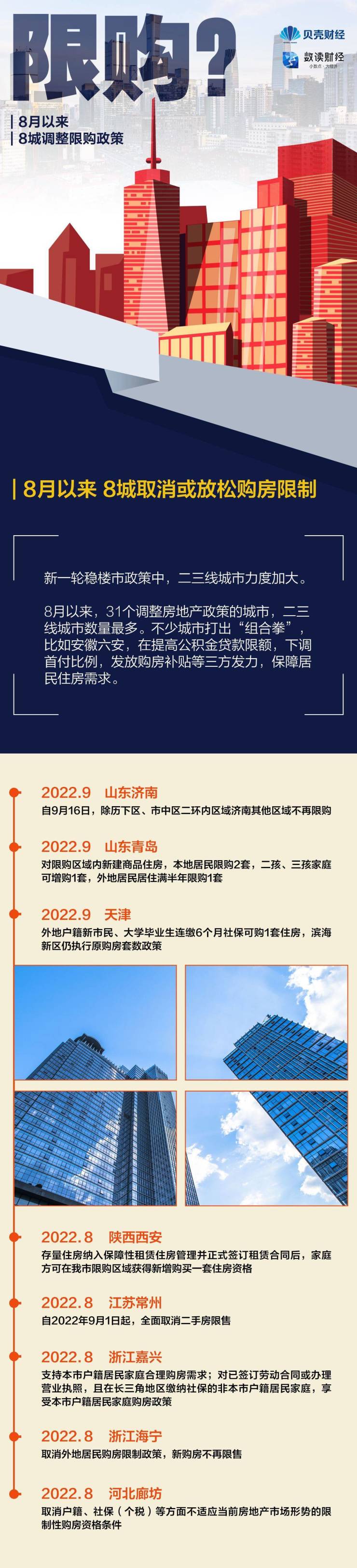据新京报贝壳财经记者不完全统计,已有8城调整限购政策,调整力度有所不同。针对新市民、大学毕业生,天津将原有的“在本市3年内连续缴纳2年以上的社保或个税”调整为6个月。浙江嘉兴将购房政策适用人群扩大至在长三角地区缴纳社保的居民家庭。江苏常州则表示,全面取消二手房限售。