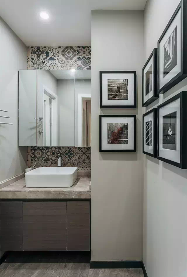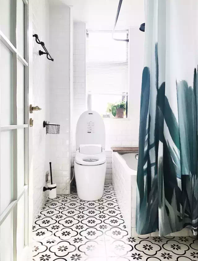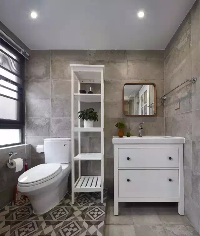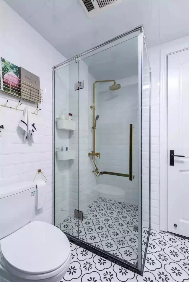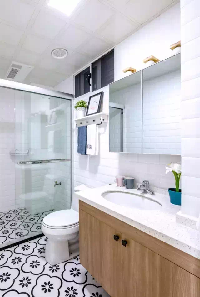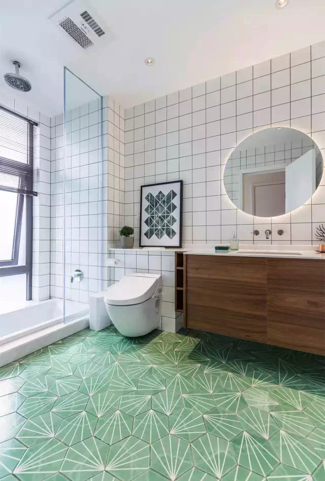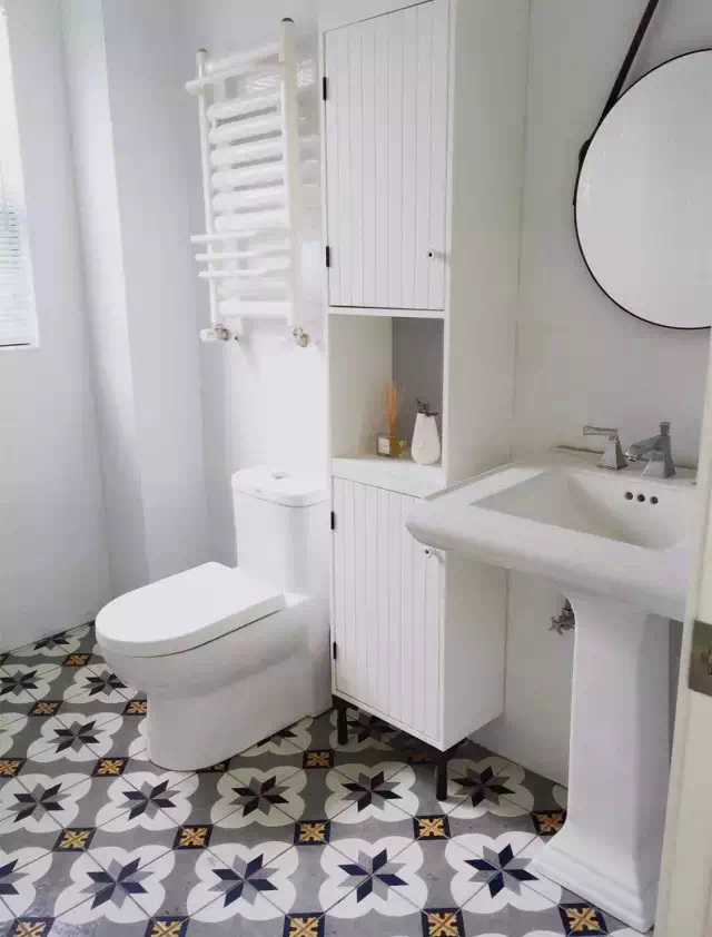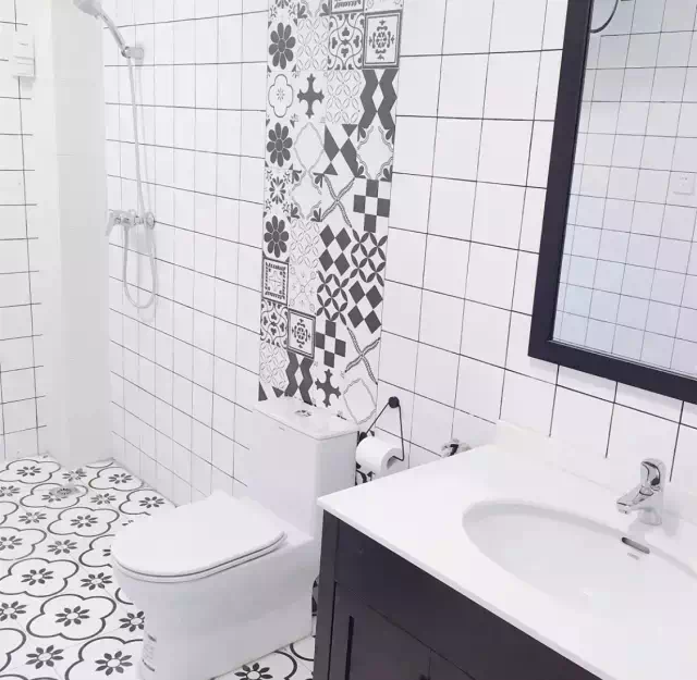 还有一种便是在卫生间的地面上铺贴花砖,营造出一种“低头是复古,抬头是时尚”的视觉效果,空间格调骤然提升。