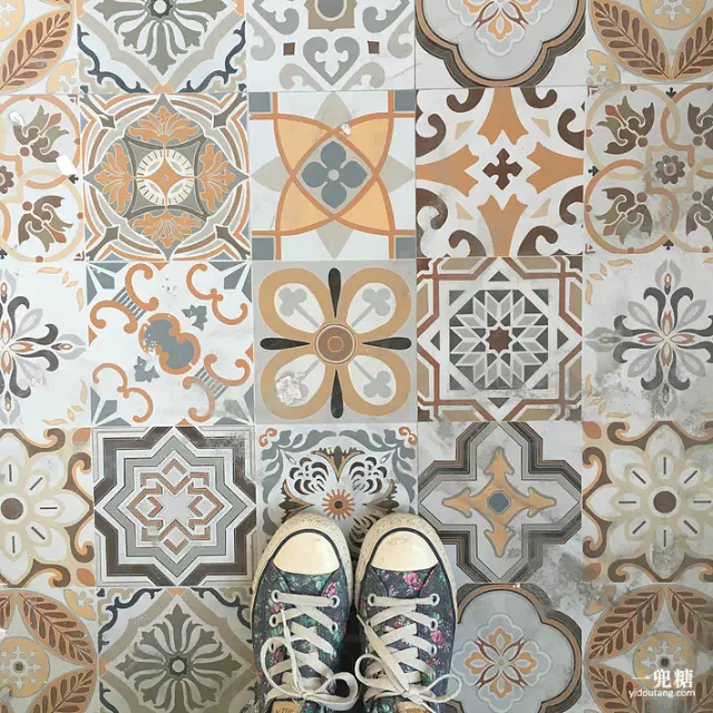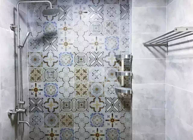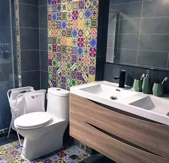 墙面地面同时铺贴花砖,相互呼应,相得映彰,可以选择全部铺满,也可以在特定的区域进行铺贴,如马桶的地面或后方的墙面。