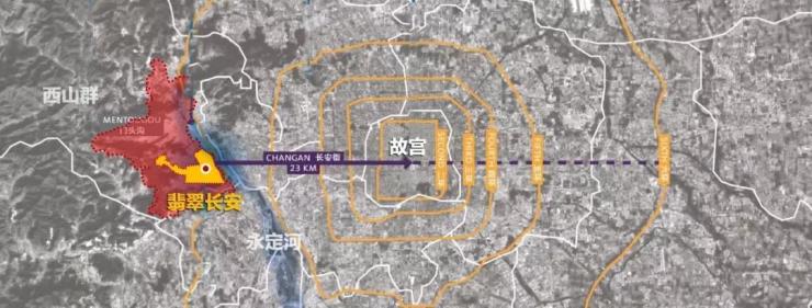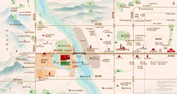 从区域来看,这个区域无疑是2019-2020年北京的高光区域,距离天安门23公里,离2019年国庆开通的长安街西延线-新首钢大桥203米,长安街西延工程是北京市2019年重点民生工程,贯穿石景山、门头沟两区。全线贯通之后,长安街“十里长街”延长至“百里”。在翡翠长安推窗就能看到长安街。