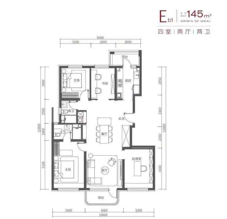 建面约145平米四居,客厅面宽4米,联通弧形阳台,南向两卧室均带有飘窗,采光及视野效果nice;北向次卧+书房紧挨着,可根据不同家庭需求灵活设计。