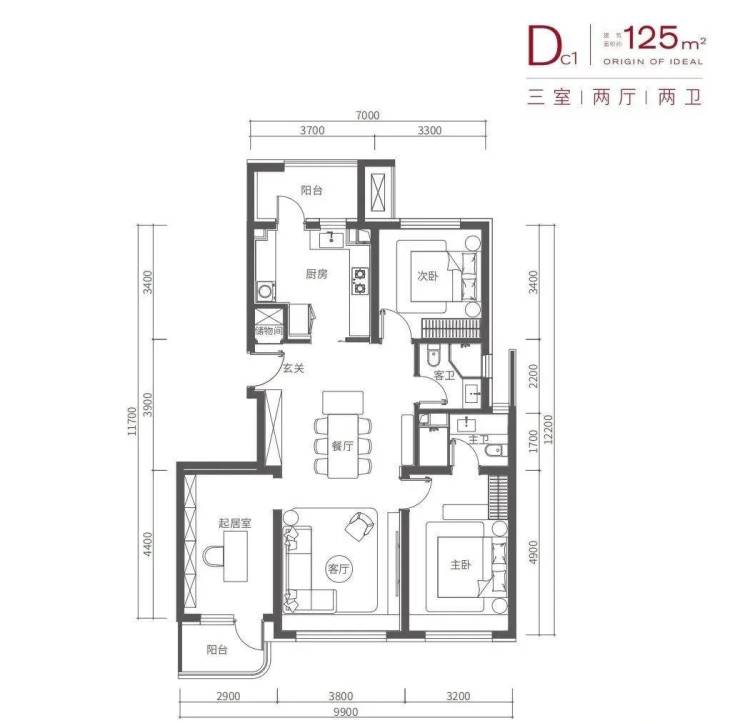 建面约125平米三居,南向三面宽约9.9米,户型全明,且更加方正通透;同样南北双阳台的配置,拓宽生活空间。