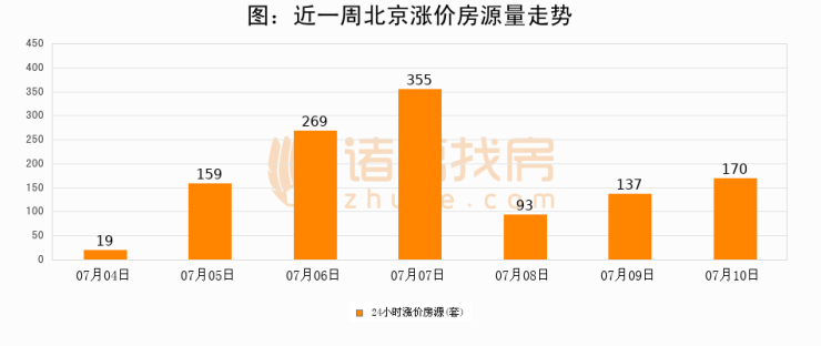 根据诸葛找房数据显示,北京24小时涨价房源量为170套,较07月09日增加33套,环比上涨24.1%。与此同时,涨价房源占比小幅扩大,业主信心有所提升。