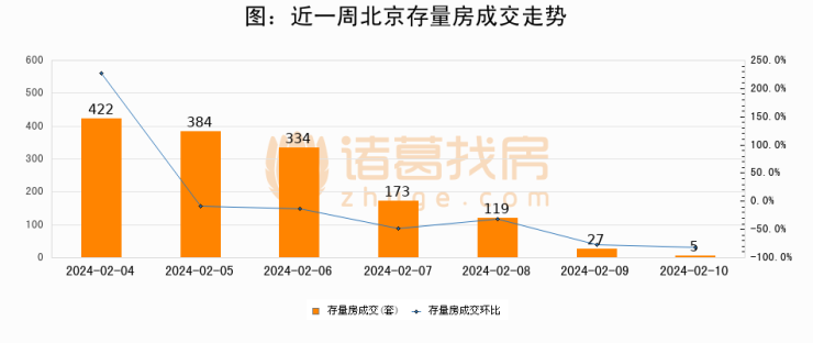 从存量房来看,2024年02月10日北京存量房单日成交5套,比昨日减少22套,环比下降81.5%。从近一周存量房成交来看,北京存量房日均成交套数为209套,02月10日单日成交5套,低于近一周平均水平97.6%。