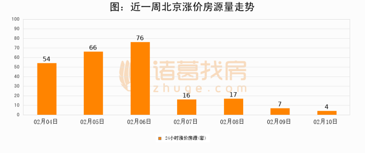 根据诸葛找房数据显示,北京24小时涨价房源量为4套,较02月09日减少3套,环比下降42.9%。与此同时,涨价房源占比小幅回落,对于购房者来说是一个入市窗口期,购房者可抓住时机入市。