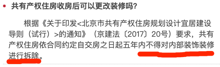 而且,按照购买共有产权的协议和北京市保障性住房的管理规定,共有产权房在交房五年内是不允许装修和改造的。
