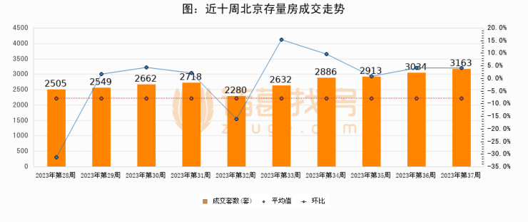存量房方面,第37周北京存量房成交3163套,较上周增加129套,环比上涨4.2%。从近十周成交走势来看,周均成交套数为2734套,本周高于平均水平15.7%。