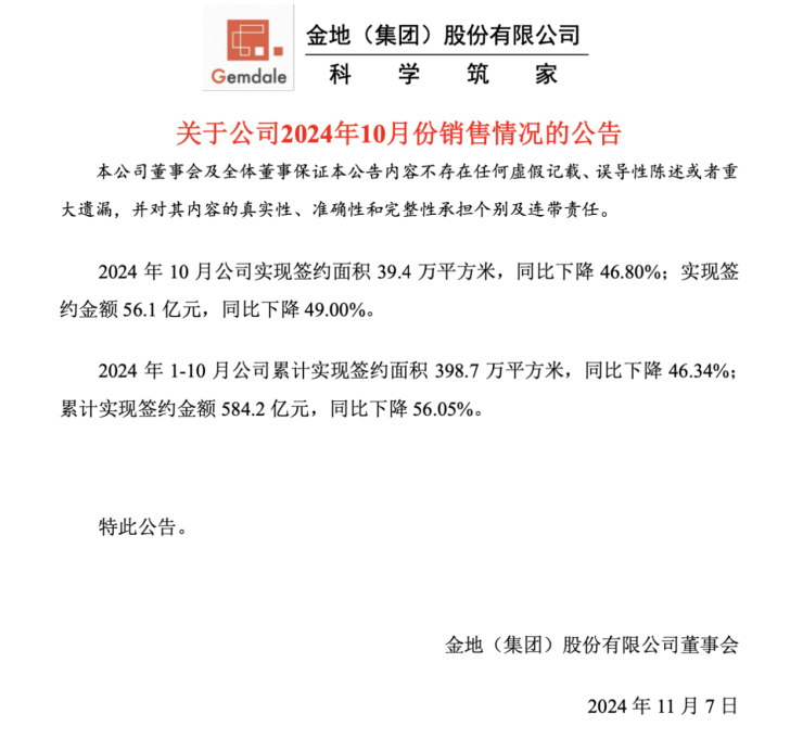 【环球网房产报道】1月6日,金地(集团)股份有限公司董事会公告披露2024年10月份销售情况。